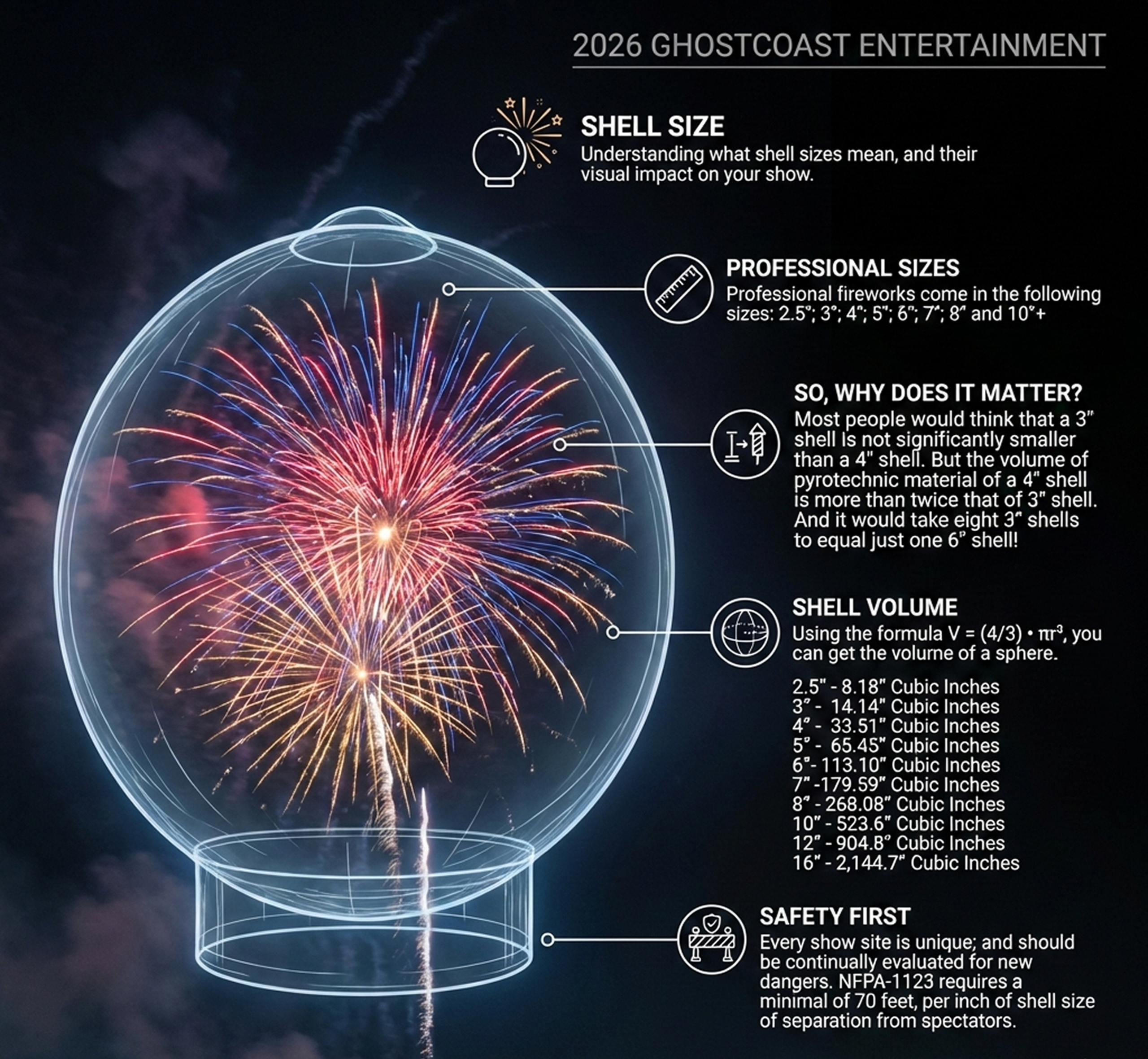 | Diameter | Burst Height (ft) | Burst Width (ft) | Typical Applications | Min Viewing Distance (ft) |